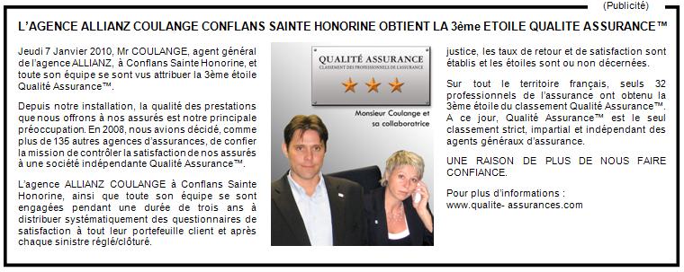 Le jeudi 7 Janvier 2010, Monsieur COULANGE, agent général de l’agence ALLIANZ à Conflans Sainte Honorine (78), et toute son équipe se sont vus attribuer la 3ème étoile de la société indépendante Qualité Assurance™.