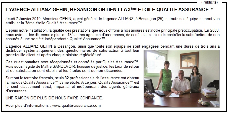 Le jeudi 7 Janvier 2010, Monsieur GEHIN, agent général à BESANCON (25), et toute son équipe se sont vus attribuer la 3ème étoile de la société indépendante Qualité Assurance™.