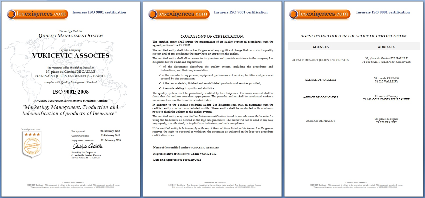Depuis un an, le centre de formation partenaire Cottille Développement, étudie le dossier de l'agence, qui pour le coup, a effectué une véritable remise en question. Comptes, organisation, fonctionnement, contrôle de la satisfaction des clients (connu grâce à des questionnaires de satisfaction)... Tout y est passé. Les résultats progressifs de cette étude ont permis aux spécialistes de Cottille Développement de conseiller Messieurs VUKICEVIC pour répondre aux critères de l'ISO 9001, car obtenir cette certification est loin d’être aisé. En France, très peu d’assureurs peuvent s’en targuer.