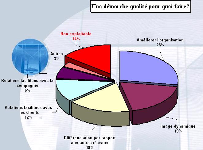 Vos 3 attentes majeures se détachent clairement : - améliorer votre organisation : mettre en œuvre un fonctionnement opérationnel et rentable de votre structure, - se différencier : valoriser les acquis de la démarche qualité par rapport aux compagnies et agents qui n'ont pas mis en place une telle démarche, - montrer un certain dynamisme : être précurseur dans la réflexion sur la qualité, volonté de souligner une orientation choisie, d'être "modèle" pour les autres agents. D'autres commentaires isolés ont été recueillis comme : "un système de management des collaborateurs" "parce qu'il est indispensable d'avoir une démarche d'amélioration de la qualité de son organisation" "image de professionnalisme".